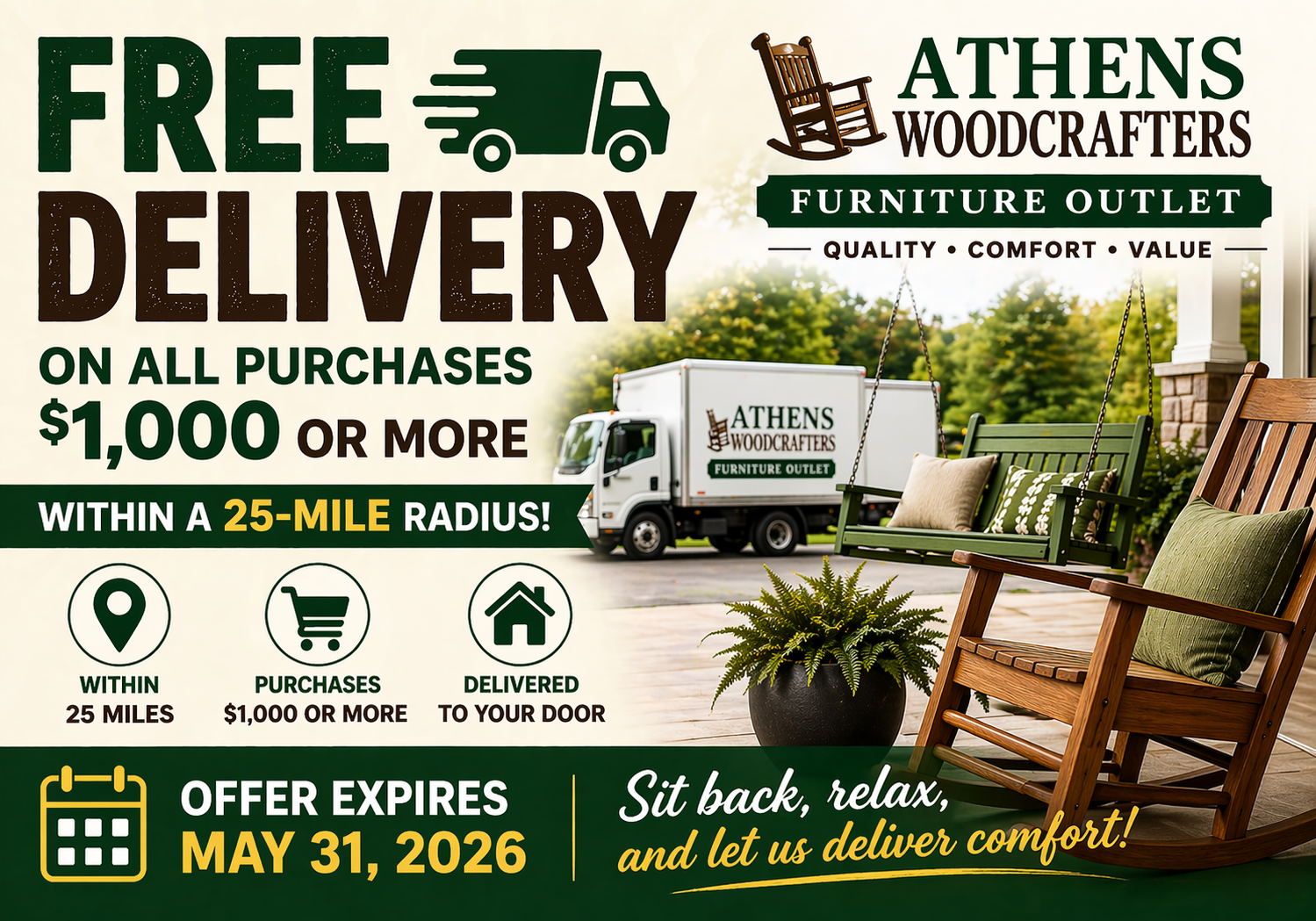 Spring and summer are the perfect time to upgrade your outdoor space—and there’s no better place to start than right here at Athens Woodcrafters Furniture Outlet!