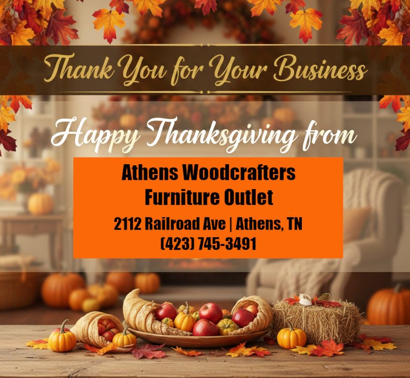 In a time when it can be hard to find what you like, be able to buy it and take it home immediately or have it delivered, you can be happy knowing that Athens Woodcrafters Furniture Outlet has 13,000 square feet of New & Pre-owned Furniture in stock and ready for you to take home. Also, we are your Rustic Furniture Headquarters for Athens, TN and surrounding areas. And we are open 7 days a week nearly year round. The only exceptions are major holidays like Thanksgiving and Christmas.